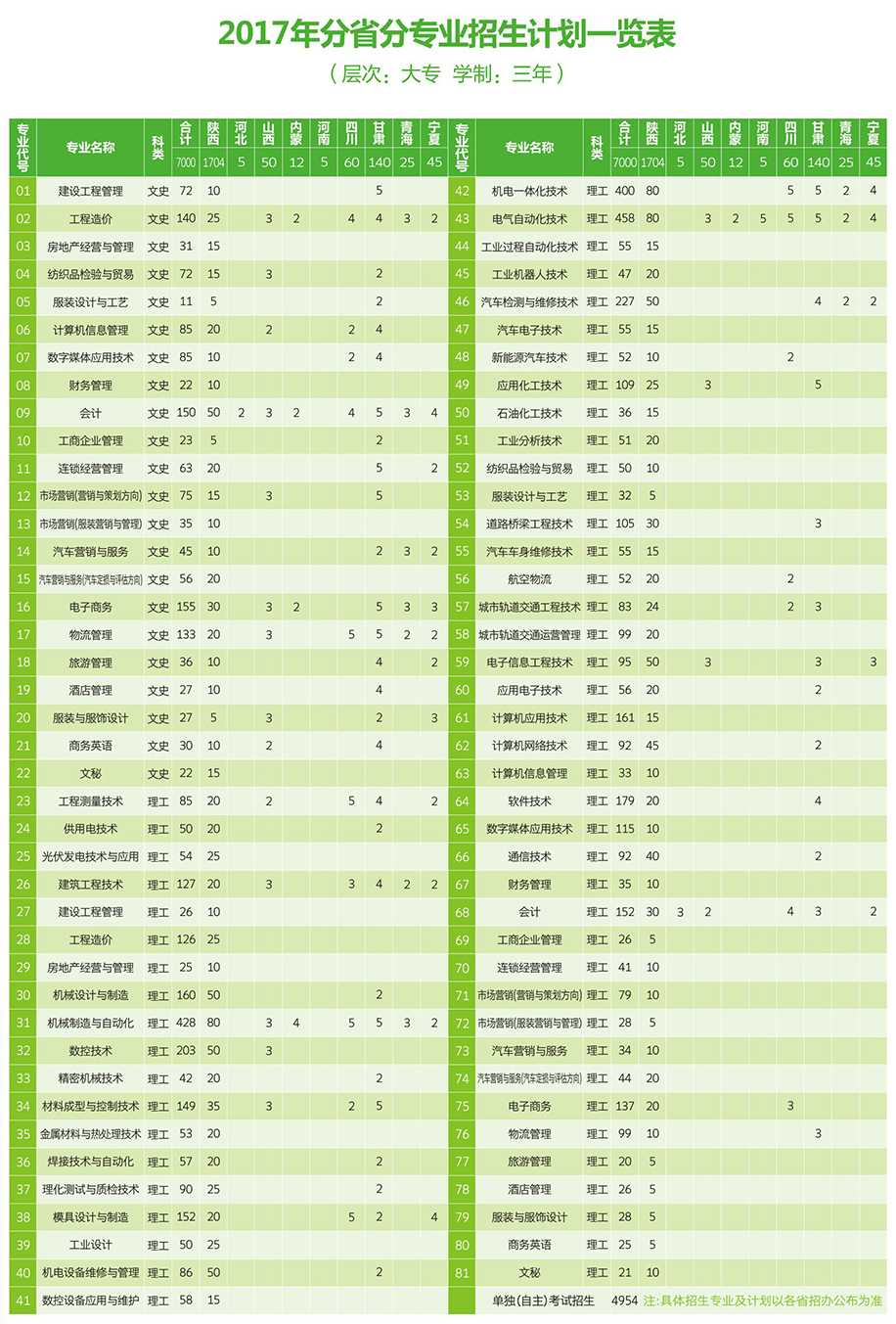 2017年我院面向9个省市拟计划招生7000名,其中:陕西6658名(含自主招生4954名),外省342名(河北、内蒙、山西、河南、四川、甘肃、青海、宁夏)。(招生专业及计划以各省招办公布为准)