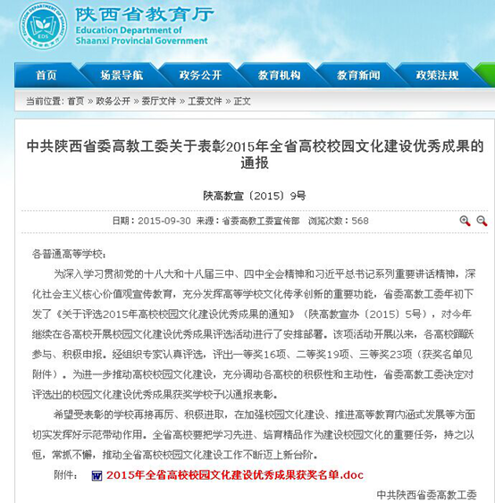 近日,根据省委高教工委《中共陕西省委高教工委关于表彰2015年全省高校校园文化建设优秀成果的通报》(陕高教宣〔2015〕9号),陕西省校园文化建设优秀成果评选结果揭晓,共评出一等奖16项、二等奖19项、三等奖23项。我院宣传教育部申报的《校园传媒作引领 实践育人结硕果》获二等奖,这也是我院连续七年获此奖项。目前我院共有“全国高校校园文化建设优秀成果奖”二等奖1项,“陕西省校园文化建设优秀成果奖”一等奖3项、二等奖4项。