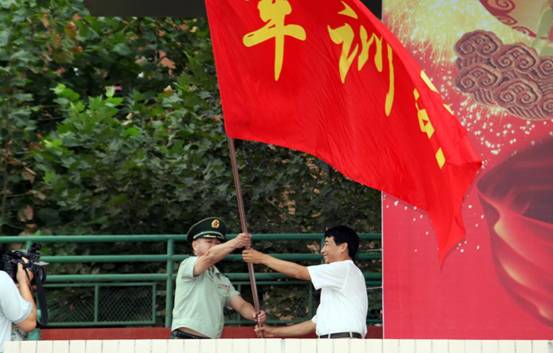 在教师、学生及新生代表发言后,党委书记崔岩为2015级新生军训团授旗并宣布军训开营,为期10天的新生军训工作全面启动。