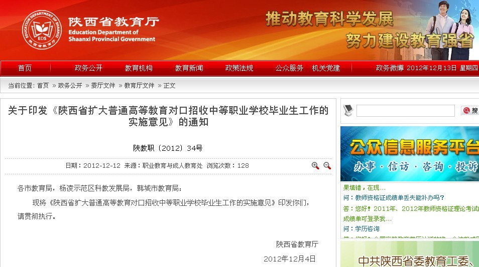 现将《陕西省扩大普通高等教育对口招收中等职业学校毕业生工作的实施意见》印发你们,请贯彻执行。