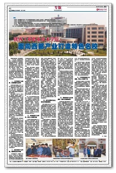 7月29日,《中国教育报》第四版以《陕西工业职业技术学院:面向西部产业打造特色名校》为题专版报道我院办学成果,分别从建设具有西部产业特征的特色专业、创新校企合作体制、优化人才培养方案、强化实训基地建设、提升社会服务能力、突出人才培养个性等六方面,介绍了我院充分发挥国家示范性高职院校建设的引领和辐射作用,探索出具有西北地区职业教育特色的发展路子,文章被凤凰网、搜狐网等媒体转载,引起社会和行业关注。