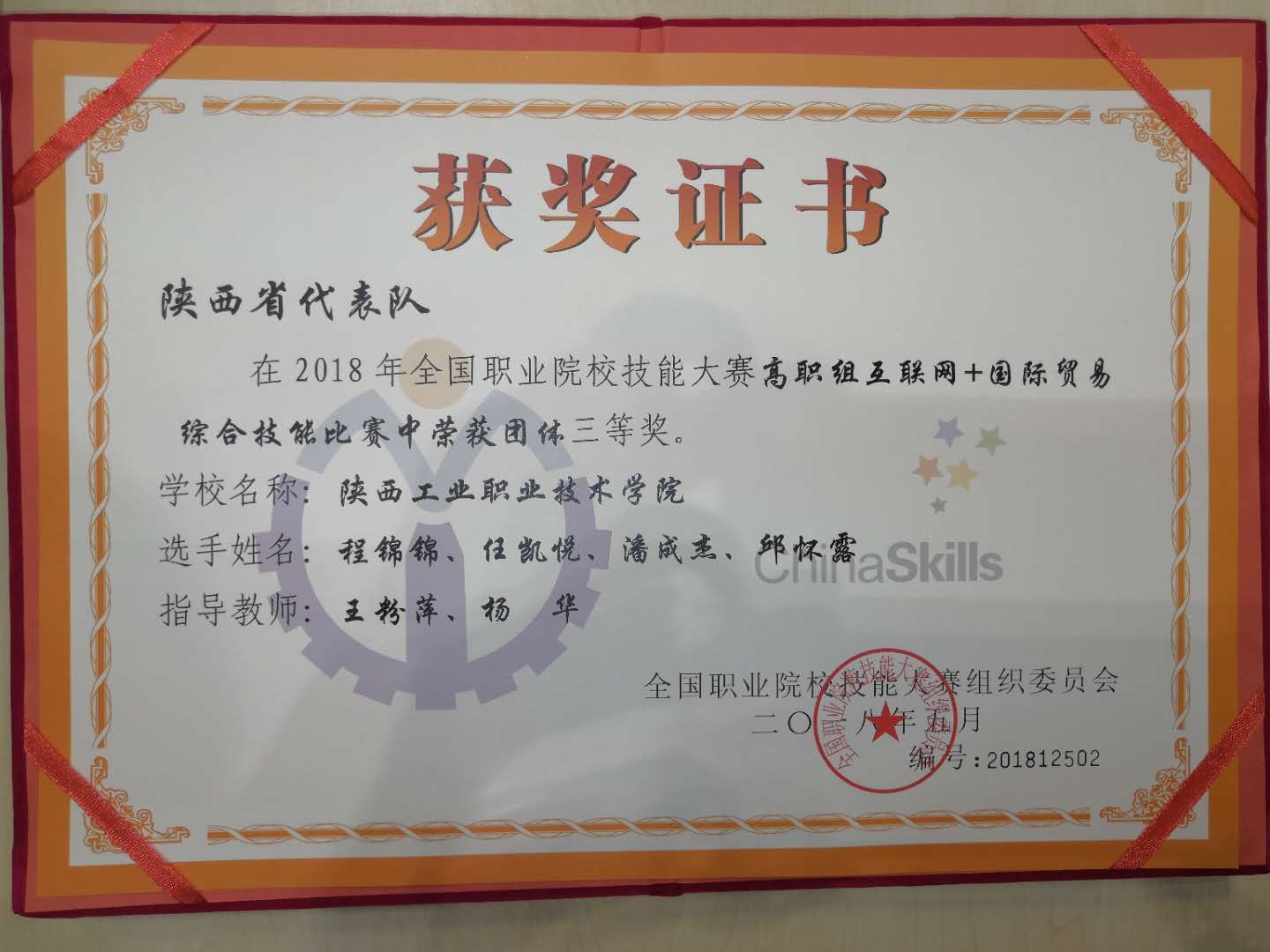 5月27日,2018年全国职业院校技能大赛“互联网+国际贸易综合技能”赛项(高职组)在无锡商业职业技术学院落下帷幕。经过两天的激烈角逐,最终由我院物流管理学院教师王粉萍、杨华指导,市场营销1602班潘成杰、任凯悦,商务英语1601班程锦锦、商务英语1602班邱怀露4名同学组成的代表队斩获团体三等奖。