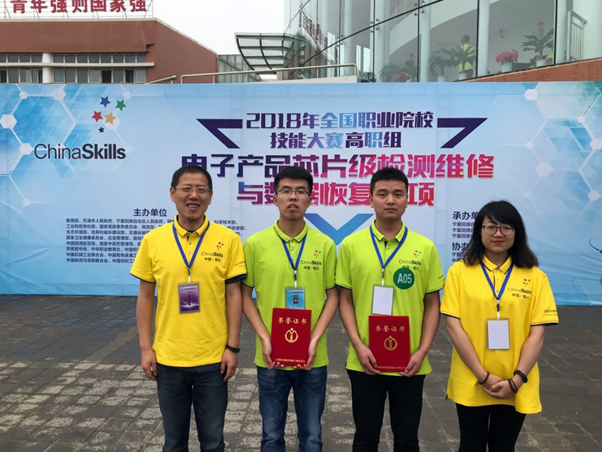 5月9日,2018年全国职业院校技能大赛“电子产品芯片级检测维修与数据恢复”赛项比赛在银川开赛,由电气工程学院教师吉武庆、杜晓岚指导,薛小锋、张照峰两名同学组成的代表队荣获该赛项二等奖。