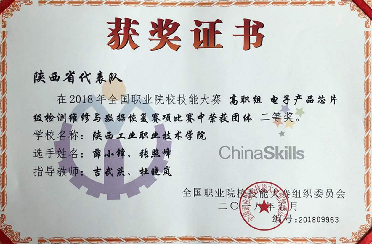 在大赛规定的4个小时内,我院参赛选手以稳定的心理素质和过硬的操作技能,按要求完成了6块功能电路板的检测维修、5块故障存储介质数据恢复以及相关工作报告的填写等工作任务,最终荣获二等奖。