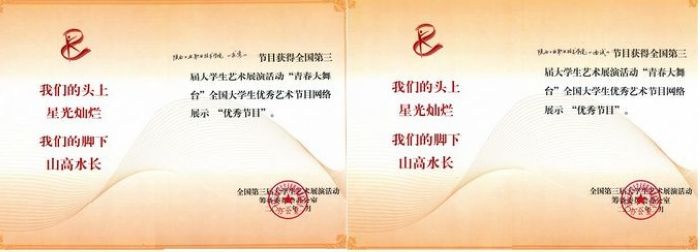 会上还颁发了我院在全国第三届大学生艺术展演的获奖证书