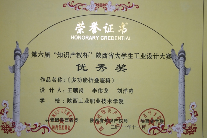 2011年11月25日,由共青团陕西省委、省知识产权局、省学联联合举办的第六届“知识产权杯”陕西省大学生工业设计大赛颁奖典礼在长安大学渭水校区举行,主办方相关领导及获奖选手参加了典礼。我院共报送了15件作品,其中由宁煜、张景学、朱凤琴等老师指导的多功能折叠座椅、可折叠多用床椅、半自动上料机三件作品,荣获了优秀奖。