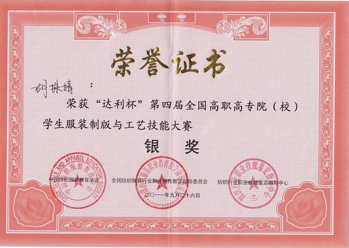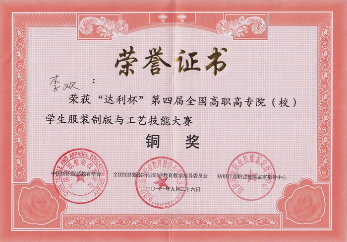 9月26日,“达利杯”第四届全国高职院校服装制版与工艺技能大赛在杭州举行颁奖典礼,我院服装艺术学院选派5名学生参加了本届大赛,并摘得1银1铜。