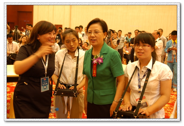 我院文秘专业08级学生魏伟伟(右一)正在为鲁昕副部长做速录