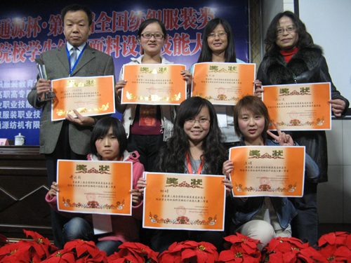 本次大赛由中国纺织服装教育学会、教育部高职高专服装纺织类专业教学指导委员会、纺织行业职业技能鉴定指导中心主办,来全国17所高职院校的115名学生参加了比赛。我院现纺936班王瑾同学的作品《大唐盛世》获得金奖,现纺829班韩艺伟同学的作品《幸福生活》、现纺830班杨婷同学的作品《春》、现纺830班卜春艳同学的作品《脸谱》获得银奖,现纺830班索晓莉同学的作品《图腾》获得铜奖,冯红莲、杜小平老师荣获优秀指导教师奖,同时王瑾同学获得面料设计师资格证书(国家职业教育二级),韩艺伟、杨婷、卜春艳同学获得助理面料设计师资格证书(国家职业教育三级),索晓莉同学获面料设计员资格证书(国家职业教育四级)。