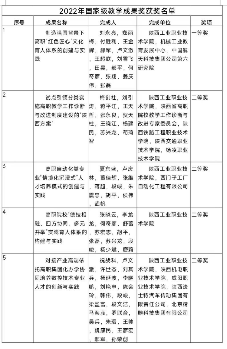 7月24日,2022年职业教育国家级教学成果奖获奖名单正式公布,我院5项成果获国家级教学成果奖,其中一等奖1项、二等奖4项,取得新突破。其中,《制造强国背景下高职“红色匠心”文化育人体系的创建与实践》获一等奖,《试点引领 分类实施 高职教学工作诊断与改进制度建设的“陕西方案”》《高职自动化类专业“情境化沉浸式”人才培养模式的创建与实践》《高职院校“德技相融、四方协同、多元并举”实践育人体系的构建与实践》《对接产业高端依托高职集团化办学 协同培养数控技术专业人才的创新与实践》4项成果获二等奖。截止目前,学院共斩获国家级教学成果一等奖4项、二等奖7项,省级教学成果特等奖7项、一等奖11项、二等奖17项。